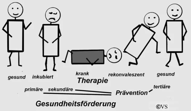 In einem Schaubild lassen sich die Bezüge der Gesundheitsförderung anschaulich darstellen: Bei einer Infektion befällt ein Keim (Einzelliges Lebewesen, Bakterium, Virus) den Körper und verursacht oft eine Gegenreaktion (Produktion von Antikörpern). Diese Prozesse stellen die eigentliche Krankheit dar. Dabei ist die Krankheit der Versuch, die Unversehrtheit des Körpers wieder herzustellen. Die Krankheit ist daher eigentlich eine gesundheitsfördernde Maßnahme des Körpers selbst.