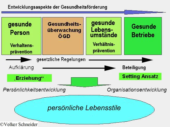 In den letzten Jahren hat sich die Gesundheitsförderung deutlich verändert. Der Weg geht fort von der persönlichen gesundheitlichen Gesundheitsförderung hin zu der Ausgestaltung der Arbeitsplätze, der Stadtbaus, des Gesundheitswesens, insgesamt zur einer Verbesserung der sozialen Bedingungen (bezeichnet als Organisationsentwicklung oder oft auch als settings)