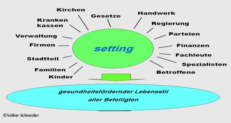Unter Setting versteht man einen Ausschnitt der sozialen und politischen Welt wie Schulen, Gemeinde, Dorf, Stadtteil, ganze Städte, oder kruz gesagt, Lebensbereiche, die man sinnvoll wissenschaftlich untersuchen kann.