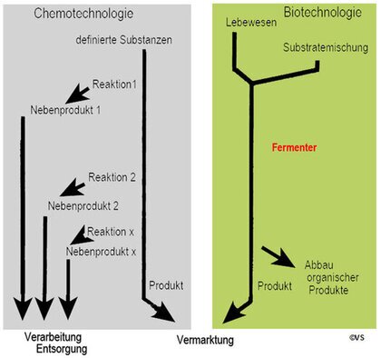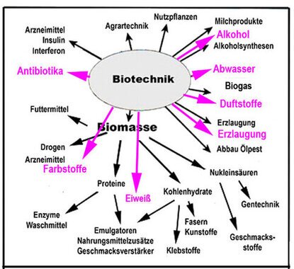 Nutzung von Mikroorganismen Überblick über die technischen Nutzungen von Bioprodukten und Biologischen Vorgängen Die Nutzung von Lebewesen in der Landwirtschaft hat eine lange Tradition. Die stoffwechselphysiologischen Möglichkeiten der Lebewesen in der Industrie verbreitet sich zunehmend und nimmt immer noch zu. Diese erprobte Zusammenstellung zeigt einige Einsatzgebiete. Für die Schule scheinen die hier vorgestellten Möglichkeiten im Unterricht selbst oder in Projekten in höheren Klassen sinnvoll. ![]() Schneider Volker u. Wilfried Probst: Biologische Prozesse in der Industrie, UB 1984; Biotechnologie:Forschung: https://www.biotechnologie.de/ (2016-02-27); http://www.uni-heidelberg.de/studium/interesse/faecher/molek_biotech.html (2016-02-27); Übersicht: https://de.wikipedia.org/wiki/Biotechnologie (2016-02-27); Gärung:https://de.wikipedia.org/wiki/Alkoholische_G%C3%A4rung (2016-02-27); http://www.chemie.de/lexikon/G%C3%A4rung.html (2016-02-27); http://www.biologie-schule.de/gaerung.php (2016-02-27); vgl. auch Bildungsserver (2016-03-05) http://www.schule-bw.de/unterricht/faecher/biotechnologie/direkteinstieg_biotec/ ![]() Vergleich Chemotechnik - Biotechnik Das Schema zeigt die Möglichkeiten und Grenzen beider Verfahren auf. Inzwischen gibt es verschiedene Übergänge und Kombinationen. Der grundsätzliche Vorteil von Biotechnischen Prozessen ist: Es entstehen nur biologisch abbaubare Nebenprodukte. | ||||||||