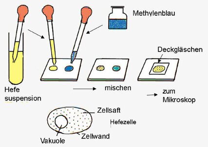 Aufgabe: Suspendiere möglichst frische Bäckerhefe (aus der Nahrungsmittelabteilung) in Wasser und untersuche unter dem Mikroskop!