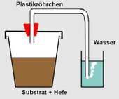 Man füllt den Kanister zu 3/4 mit frischem Traubensaft (oder 5%iger Dextroenergen-Lösung) und 2 Päckchen in wenige Wasser aufgelöster Bäckerhefe. Nach einigen Tagen perlen Gasblasen durch das Gärröhrchen. Wenn die Gasentwicklung nachlässt, ist ausreichend Alkohol entstanden.