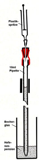 1) In je 40 ml 1 Molare Saccharose- Lösung (= 13.7 g / 40 ml) gibt man 5 g Hefe2) Mehrfach mit Pipette aufsaugen und durchmischen.3) Mit der Plastikspritze bis zur Markierung 0 hochsaugen.4) Immer nach 2 min das Gasvolumen notieren.5) Mit der Spritze wieder auf 0 hochsaugen, so dass immer dieselbe Menge Reaktionsvolumen (10 ml) vorhanden ist.Im Vorversuch sollten 2ml Gas nach 5 bis 10 Minuten entstanden sein.