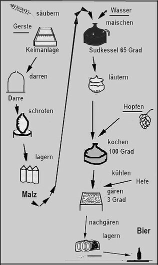 Hefen in der Technik Info: Mikroorganismen erlangen in der Biotechnik und in der allgemeinen Verfahrenstechnik zunehmend an Bedeutung. Die Vorteile liegen auf der Hand: Die sich rasant weiter entwickelnden Verfahrenstechniken unter Nutzung von Lebewesen – meist gentechnisch veränderten Bakterien - werden angewandt bei der Herstellung von Vitamin C, bei der Spaltung von Stärke zur Gewinnung von Industriezucker, bei der Herstellung von Hormonpräparaten, bei der Abwasseraufbereitung, in der Penizillin- Produktion, -- um nur einige Beispiele zu nennen. -- Aber auch schon seit alters her: bei der Brotherstellung, bei der Gewinnung von Edelkäsesorten, bei der Herstellung von Joghurt, beim Bierbrauen, bei der Kelterung von Weinsaft. Im Mittelalter war Bier – neben Wein – das Getränk der Wahl, da es wesentlich weniger verunreinigt und keimbelastet war als das übliche Brunnenwasser. Es gehörte zu den hausfraulichen Pflichten, Bier selbst herzustellen. Als Mikroorganismus wurde und wird Hefe eingesetzt, ein Einzeller, der systematisch zu den Pilzen gerechnet wird. Heute gibt es viele Neuzüchtungen für sehr unterschiedliche Verfahren, zudem ermöglicht die Gentechnik den Transfer von Genen. Auf diese Weise entstehen praktisch neue Lebewesen mit neuen Eigenschaften. Der hier dargestellte Versuch hat historisch doppelte Bedeutung, da er eines der ersten Beispiele für den Einsatz eines Lebewesens und die Nutzung eines Enzyms (Amylase aus Gerstenkeimlingen) und eines Lebewesens (Hefe) für einen großtechnischen Prozess darstellt. Bierbrauen als nachvollziehender Versuch eignet sich als Projekt und als Vorbereitung zum Besuch einer Brauerei. In der Klasse können weitere Versuche durchgeführt werden. Die Bierherstellung sollte bis zum Jungbier durchgeführt werden, einem ungereinigten noch braun gefärbten Bier, das allerdings nicht zum probieren verwendet werden sollte!: die Herstellung im Schulalltag kann nicht keimfrei durchgeführt werden!! Der Geruch ist aber unverkennbar. | ||
