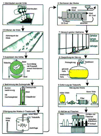 Weinbau Zur Geschichte: Die Urheimat der Weinrebe sind Kaukasus und Nordpersien. Funde von Ansammlungen von Traubenkernen weisen darauf hin, dass vor rund 8000 Jahren in Syrien und vor rund 3500 Jahren in Süddeutschland Wein hergestellt worden ist. Aber erst die Römer haben durch Anlagen von Rebflächen den landwirtschaftlichen Weinbau in Süddeutschland eingeführt. Heute stellt der Weinbau einen wichtigen Wirtschaftszweig in den warmen Gegenden Deutschlands dar (z. B. Rheingau, Ortenau, Kaiserstuhl, Bodenseegebiet). Wein hat seit alters her in der Theologie besondere Bedeutung: im Alten Testament wird Wein als Mittel beschrieben, „der Traurigen hilft". Im Messopfer wird Wein zum Sinnbild göttlicher Natur. In der Medizin wurde Wein als Arzneimittel zur Linderung von Schmerzen z. B. bei der Geburt genutzt. Schon früh war die desinfizierende Wirkung von Alkohol bekannt. Ebenso alt sind die Warnungen vor zu viel Wein. Im Mittelalter wurde empfohlen, dem Wein Aale oder Frösche zuzusetzen, um den Trinker abzuhalten. -- Bis zur Einführung der hygienisch einwandfreien Trinkwasserversorgung seit 1880 war jedoch der Wein das am wenigsten schädliche Getränk. Heute spielt der Wein als „Genussmittel" eine durchaus strittige Rolle. Die Untersuchung der Vorgänge, die aus Traubensaft Wein werden lassen, war der Anlass für die Entwicklung einer ganzen Industrie: bewusste Kellertechnik, überlegte Anbaumethoden, durch Züchtung verbesserte Rebsorten und Vervollkommnung der Gärtechnik durch Züchtung neuer Hefesorten. Heute dient Alkohol als Grundstoff für viele Synthesen in der Industrie. ![]() Für einen „guten Wein" sind folgende Faktoren wichtig: