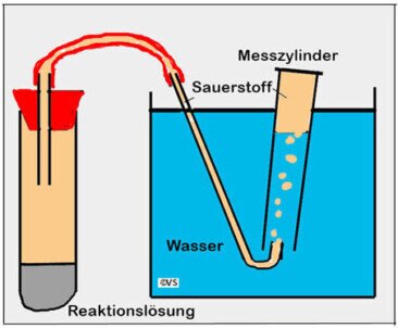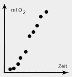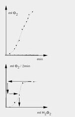 Man mischt 5m Wasser, 3ml H2O2 Lösung und erst dann 2 ml Enzymlösung zusammen und schließt das Reagenzglas an die Apparatur an. Die Reaktion sollte so rasch ablaufen, dass in 20 Minuten die Reaktion zum Stillstand kommt. Das heißt, dass dann alles H202 verbraucht ist.