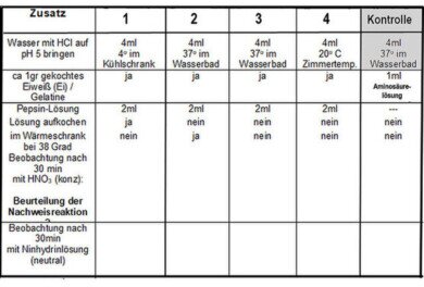 Weisen Sie nach, dass die Pepsin- Reaktion pH-abhängig ist! Stellen Sie eine geeignete Tabelle zusammen, mit deren Hilfe der Nachweis geführt werden kann!