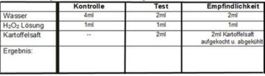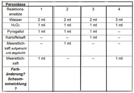 1: Man stellt sich einen Saft von Meerrettich her: etwas Meerettich aus dem Glas nehmen, aufschäumen und evtl. filtrieren.2: Das Filtrat sofort im Eisbad kühlen und für die Reaktion aufbewahren.3: Lösung von Pyrogallol in Wasser: 1g Pyrogallol in Wasser