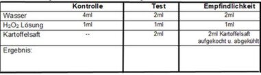 Messer, Reagenzgläser, 200 ml Becherglas, Brenner oder Heizplatte, Katalase, Wasserstoffperoxid,