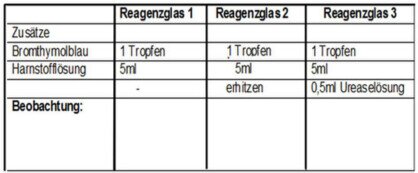 Material: Sojabohnen, Reagenzgläser, Harnstoff, Thioharnstoff, Wasser, Bunsenbrenner