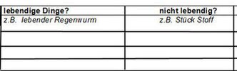 Nachweis von "lebendig sein": Sachliche und didaktische Vorüberlegungen: In der dritten oder vierten Klasse sind die Vorstellungen darüber, was lebt und nicht lebendig ist, noch fließend. So bleibt der Teddybär noch lange "lebendig", eine Pflanze noch eher als tot bezeichnet, ein Blitz ist "lebendig", ein Fluss ebenfalls. Die Biologen können immer noch nicht sagen, was das Leben ist. Sie können aber sehr genau die Merkmale des Lebendigen bzw. der Lebewesen nennen: Fortpflanzung: Lebewesen vermehren sich. Stoffwechsel: Pflanzen geben Kohlenstoffdioxid ab. Sie haben Stoffwechsel. Wachstum: Lebewesen können wachsen und sich dabei verändern.. Einführung: Hier soll ein Versuch geschildert werden, der sich mit dem "Stoffwechsel" als Kennzeichen des Lebens befasst. Nur Lebewesen zeigen einen solchen Stoffwechsel. Er kann damit als Nachweis für "Lebendig sein" aufgefasst werden. Am einfachsten lässt sich der Stoffwechsel als Gasaustausch nachweisen. Ein empfindlicher Nachweis für diesen „Stoffwechsel“ gelingt mit Bromthymolblau- Lösung. Dies ist ein Farbstoff, der bei Wechsel des pH-Werts seine Farbe verändert. Bromthymol in Wasser bei pH 6,5 BLAU Bromthymol in Wasser bei pH 5,5 farblos bis GRÜN Wenn das Objekt lebt, wird die Farbe verschwinden, weil Kohlenstoffdioxid vom Objekt abgegeben wird und das Gas den pH Wert und damit auch die Farbe des Farbstoffs sich ändert. ![]() Eigentlich wird eine pH-Wert Änderung von Bromthymolblau in Wasser angezeigt. Im Rahmen dieses Versuchs kann man die Farbänderung aber als Nachweis für das Entstehen der schwachen Kohlenstoffsäure H2CO3 werten, die durch Eindringen von CO2 in Wasser entsteht. Man kann die Reaktion durch Einblasen von Ausatemluft einer Schülerin, eines Schülers den Farbumschlag testen. Man gibt wenige Tropfen Bromthymolblau in Wasser, setzt sehr stark verdünnte NaOH oder sehr wenig HCl zu, damit ein blauer Farbton erreicht wird. Es soll eine klare, blaue stabile Lösung im kleinen Becher vorliegen. Dabei ist eine große Oberfläche von Vorteil. Als Testobjekte für rasche Ergebnisse sind geeignet: Banane, Apfel, Brot, Käfer (Abdecken der Schale mit Gaze), Schnecken, Blätter im Dunkeln gehalten, Atemluft von Menschen. Für den Testbehälter ist ein aus Styropor zugeschnittener Deckel ausreichend. Man kann auch eine flache Kunststoffdose für Nahrungsmittel verwenden. Das vom Testmaterial her in die Lösung hinein diffundierende Kohlenstoffdioxid sollte die Lösung spätestens innerhalb von 30 Minuten entfärben. Die Lösung kann man überprüfen, indem man Ausatemluft eines Schülers in den Behälter (nicht in die Lösung) einbläst. (nach einer Vorlage von Monika Reusch u. Volker Schneider) | ||