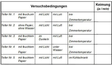 1. Bereite 5 kleine Teller vor, indem du den Boden mit Küchenkrepp auslegst.2. Verteile möglichst gleichmäßig den Samen, den du ausgewählt hast, auf dem Papier.3. Decke die Samen mit feuchtem Krepppapier sorgfältig ab. Benutze dabei wenig Wasser!4. Dann verändere die Bedingungen, bei denen die Samen vielleicht keimen können. Lege dir dazu eine Tabelle nachfolgendem Muster an:5. Untersuche nach 2bis 4 Tagen, ob aus den Samen schon die Würzelchen kommen! Notiere in der letzten Spalte, ob ja oder nein.