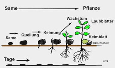 Wie Pflanzen wachsen Vorbemerkung Wenn man je einen Bohnensamen in Gartenerde in einem großen Joghurtbecher in Folge alle 2 Tage einbringt und wachsen lässt, so erhält man eine Reihenfolge von Pflanzen in den verschiedenen Wachstumszuständen innerhalb von 7 bis 10 Tagen. In der Klasse kann man die Becher auf Alufolie ausleeren, die einzelnen Pflänzchen säubern und in einer Reihe anordnen lassen. Die Schülerinnen und Schüler können auf diese Weise sozusagen im Zeitraffer das Wachstum untersuchen und im Arbeitsblatt eine Reihenfolge zeichnen. Sie finden, dass »Wachstum« nicht bloß eine Vergrößerung oder Gewichtszunahme ist, sondern auch eine wesentliche Veränderung von Aussehen und Können beinhaltet (= Ontogenese). Diese Beobachtung kann auf alle Lebewesen erweitert werden. Der Versuch ist daher als exemplarisch anzusehen. Das Ergebnis kann wie im Bild gezeigt aussehen. Die genannten Teile sind eindeutig zu identifizieren und können in ein leeres Protokoll eingezeichnet werden. Wachstum Formveränderung: Lebewesen verändern sich während ihres Lebens. (Im Gegensatz zu Flüssen oder Kristallen, die nur an Masse ("wachsen") Vererbung: Lebewesen übertragen Eigenschaften auf ihre Nachkommen. Reizbarkeit: Lebewesen setzen sich mit ihrer Umgebung auseinander. Stoffwechsel: Lebewesen nehmen Nahrung und scheiden Stoffe aus. Beispiel: Wachstum von Bohnensamen im "Zeitraffer": ![]() | ||