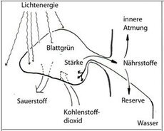 Photosynthese -- Nährstoffe aus Wasser Kohlenstoffdioxid und Licht Einführung In der Photosynthese wird Wasser gespalten. Sauerstoff bleibt übrig und der Wasserstoff reduziert Kohlenstoffdioxid zu Zucker und Aminosäuren als erste nachweisbare organische Verbindungen. Die Photosynthese-Reaktion ist die weitaus größte und wichtigste chemische Umsetzung auf der Erde. • Sie macht die Erde zum blauen Planeten durch die Abgabe von Sauerstoff in die Atmosphäre. • Sie stellt die energiereichen Substanzen für den Stoffwechsel aller Lebewesen auf der Erde (Zellstoffwechsel). • Sie stellt die Reservestoffe für Pflanzen her, die der Ernährung der Tiere und der Menschen dienen. • Durch sie sind die Kohlelagerstätten und die Erdölfelder entstanden, aus denen die Industrie bis heute ihren Energiehunger stillt. • Durch sie wird Holz produziert, das den Menschen in verschiedensten Formen als Baumaterial oder z. B. als Papier dient. Die Erforschung der Photosynthese ist durchaus noch nicht abgeschlossen. Dies gilt sowohl für die erdgeschichtliche Dimension als auch für die Stoffwechselprozesse . https://detektor.fm/wissen/forschungsquartett-kuenstliche-fotosynthese Schema der Photosynthese ![]() Es wird schon lange diskutiert, wann in der Erdgeschichte die Photosynthesereaktionen „erfunden“ wurden. Angenommen wird, die ersten Anfänge aus chemisch gebundener Energie (z.B. aus H2S) Zucker zu gewinnen, vor rund 3.5 Milliarden Jahren einsetzten. Erst sehr viel später vor rund 2.5 Milliaden Jahren entwickelte sich die Möglichkeit, aus Wasserspaltung die Energie für die Zuckersynthese zu gewinnen. Damit erst wurde die Sauerstoffanreicherung in der Atmosphäre möglich. Der Wirkungsgrad der Photosynthesereaktion liegt heute bei rund 20%. Auf Grund der vielen Stoffwechselprozesse ist aber anzunehmen, dass aber letztendlich nur 1.5 % der eingestrahlten Sonnenenergie für die Organismen zur Verfügung stehen. Trotzdem werden pro Jahr rund 1,5 1011 Tonnen organischer Masse (Biomasse) hergestellt. Diese Biomasse wurde wieder durch die Pflanzen selbst wie auch durch die Tiere abgebaut. Sodass sich ein Gleichgewicht von Kohlenstoffdioxid von 0,3 % und von Sauerstoff von rund 20% in der Luft etablieren konnte. Die überschüssige Biomasse die in den Jahrmillionen anfiel, ist als Erdöl, Kohle oder Braunkohle gespeichert. Vereinfachte Darstellung der Photosynthese (evt. als Zusammenfassung): ![]() Infos Weiler/Nover (2008): Botanik, 253-295, Thieme Lüttge U., M.Kluge, und G. Bauer (2005): Botanik. Wiley-VCH, Weinheim https://de.wikipedia.org/wiki/Photosynthese https://www.lernhelfer.de/schuelerlexikon/biologie/artikel/fotosynthese https://www.chemie.de/lexikon/Photosynthese.html https://www.pflanzenforschung.de/de/pflanzenwissen/lexikon-a-z/photosynthese-285 https://detektor.fm/wissen/forschungsquartett-kuenstliche-fotosynthese | ||