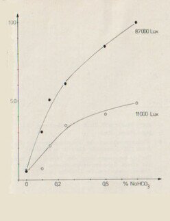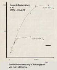 Tipp: für die experimentelle Erfassung der Werte hat sich folgendes Vorgehen bewährt: Man belichtet ein Sproßstück Elodea densa in destilliertem Wasser solange, bis eine Gasentwicklung unterbleibt. Dann erhöht man aufsteigend die CO2 Konzentration in 10 minütigen Abständen. Dabei braucht man nicht zu befürchten, dass die Diffusion von CO2 limitierend wirkt: schon nach 3 bis 4 Minuten war immer eine maximale O2 Produktion je nach Lichtmenge zu beobachten.