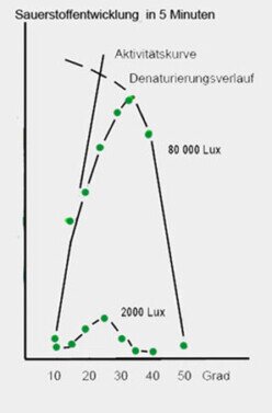 - Messung der Sauerstoffentwicklung bei verschiedenen Wellenlängen: Rotlicht, Gelblicht, Grünlicht, Weisslicht Weißlicht