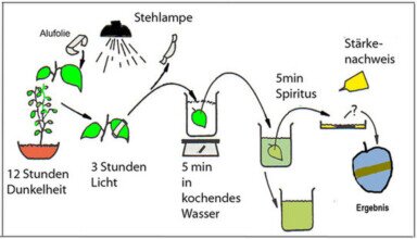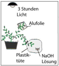 1 Am Tag zuvor stellt man eine Zimmerlinde unter eine Stehlampe und lässt die Pflanze über Nacht beleuchten.Dabei deckt man einige Blätter teilweise mit Alufolie ab. Andere Blätter bestreicht man an der Unterseite mit Vaseline. Wieder andere Blätter bringt man in eine durchsichtige Plastiktüte, in die man eine Schale mit verdünnter NaOH Lösung stellt und verschließt.2 Vor dem Test nimmt man die behandelten Blätter ab und markiert sie mit unlöslichem Schreiber oder Papiermarker am Blattstiel.3 Die Blätter werden in kochendem Wasser abgetötet.