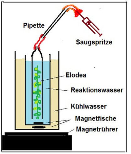 Dazu nutzt man eine Pipette mit µml Einteilung. Durch Hochziehen des Wasserstands in der Pipette lässt sich immer wieder die Sauerstoffproduktion genau bestimmen.