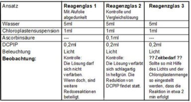 Hill-Reaktion mit isolierten Chloroplasten, Einfluss der Lichtmenge, der Kohlenstoffdioxidmenge, der Lichtqualität an der Photosynthese beteiligte Farbstoffe Fluoreszenz bei isoliertem Chlorophyll