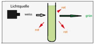 absorbiertes Licht) als Grünlicht zu erkennen ist.4: Im Dämmerlicht zeigt sich die Fluoreszenz als rotes Licht von der Seite