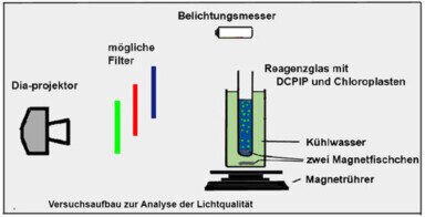 Zunächst untersucht man verschiede Filter, um festzustellen, ob sie eine für die Photosynthese optimalen Lichtabsorption Licht absorbieren, bzw. durchlassen. Es zeigte sich, dass alle Filter (blau – grün- rot) brauchbar sind. Allerdings sind Plastikfilter (Bastelgeschäft) wesentlich billiger und für die Versuche leichter zu nutzen, da sie unzerbrechlich sind.