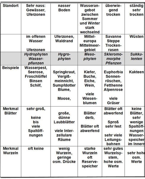 Pflanzen Moose, Farne und Blütenpflanzen sind Eukaryonten (Pflanzen mit Zellen mit echtem Zellkern). Heute sind etwa 400 000 Pflanzenarten bekannt, von denen rund 80.000 bedroht sind. Alle Zellen der höheren Pflanzenzellen haben eine starke Zellhülle aus Zellulose, die den osmotischen Druck auffängt. Oft ist aus dem Bau der Zellen auch die Funktionen zu erkennen. Der grundsätzlich einfache Aufbau hat vielfältige Abwandlungen in der Evolution erfahren. Schematischer Aufbau einer höheren Pflanze Als höhere Pflanzen bezeichnet man Pflanzen, die nach diesem Schema aufgebaut sind und die ein steuerbares Wasserleitungssystem haben. In Wirklichkeit wird dieser Bauplan vielfach abgewandelt. Sachliche Grundlage: Hier geht es um Versuche, die sich auf die Leistungen von Wurzel, Spross und Blatt beziehen. Der Spross vermittelt den Wassertransport in die Blätter und den Nährstofftransport aus den Blättern in die Reserveorgane (Leitbündel). Dazu ist eine lückenlose Abdichtung (Rinde, Borke) nach außen sehr wichtig. Außerdem sorgt der Spross für die Festigkeit der ganzen Pflanze. Die Wurzel hat neben der Verankerung der Pflanze im Boden die Aufgabe, Wasser und gelöste Salze aufzunehmen. Viele Wurzeln speichern Reservestoffe. Das Blatt ist das Organ für die Photosynthese: Es stellt Stärke und davon ausgehend alle anderen benötigten Stoffe her, die in der Pflanze verbleiben. Gleichzeitig geben die Blätter überschüssigen Sauerstoff nach außen ab. Die Spaltöffnungen der Blätter gewährleisten eine gewisse Zur Didaktik: Gegenwarts- und Zukunftsbedeutung: Tierisches und menschliches Leben ist ohne die Fotosyntheseleistung der Pflanzen auf unserem Planeten nicht möglich. Die Bedeutung der Pflanzen kann man daher nicht überschätzen. Pflanzen sind darüber hinaus besonders geeignet, in die wissenschaftliche Arbeitsweise einzuführen, da die Versuche zu den Leistungen der Pflanzen vergleichsweise einfach sind und die emotionale Hemmung gegenüber diesen Lebewesen in unserer Kultur weitgehend fehlt. Lit: Yann Fragnière, Nicolas Ruch, Evelyne Kozlowski, Gregor Kozlowski: (2018) Botanische Grundkenntnisse auf einen Blick Haupt, Bern Weiler, E. u. L. Nover (2008): allgemeine Botanik, Thieme Gerhardt-Dierksen, A. (2018) Blickpunkt Pflanze, Aulis Pflanzenbau und Wasserangebot Die Pflanzen sind extrem auf das Wasserangebot angewiesen. In der Evolution haben sich die Pflanzen nach Maßgabe des Wasserangebots entwickelt. Daraus geht hervor, wie wichtig das Wasserangebot in der Evolution gewesen ist und noch ist. Auf Grund der Standorte kann man auf den Bau der Pflanzen schließen und eine ökologische Einstufung vornehmen. Pflanzenbau und Standort bzw. ökologische Nische: Photosynthese Gegenwarts- und Zukunftsbedeutung: Tierisches und menschliches Leben ist ohne die Fotosyntheseleistung der Pflanzen auf unserem Planeten nicht möglich. Die Bedeutung der Pflanzen kann man daher nicht überschätzen. Pflanzen sind darüber hinaus besonders geeignet, in die wissenschaftliche Arbeitsweise einzuführen, da die Versuche zu den Leistungen der Pflanzen vergleichsweise einfach sind und die emotionale Hemmung gegenüber diesen Lebewesen in unserer Kultur weitgehend fehlt. Schneider, V. (1995): Wasserhaushalt der Pflanzen, Fotosynthese IN: Eschenhagen, Katmann, Rodi: Handbuch des Biologieunterrichts, Bd. 3: S.11-45 ; Systematik: https://de.wikipedia.org/wiki/Systematik_des_Pflanzenreichs; Gerhardt-Dirksen, A. (2010): Blickpunkt Pflanze Aulis; Weiler/Nover (2008): Botanik, Thieme https://www.biologie-seite.de/Biologie/Pflanzen https://lehrerfortbildung-bw.de/u_matnatech/bio/gym/bp2004/fb3/5_kenntnis/9_buch/ | ||