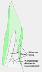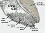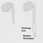 2: Sobald das Würzelchen etwa 1 cm lang ist, trägt man von der Spitze her im Abstand von 1mm mit wasserfester Tusche Punkte auf.3: Nach einigen Tagen überprüft man, wo sich die Abstände der Tuschemarken verändert haben.