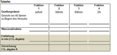 Tabelle zum Nachweis der Wasseraufnahme vor der Keimung