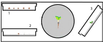 5: Man gibt einige Tropfen Wasser zu jeder Petrischale (3) und stellt sie schräg auf. in (Die Keimlinge bleiben auf Grund ihrer Schleimschicht haften).