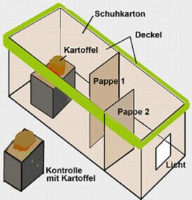 1. Stelle die Pflanzschale mit der Kartoffel in den Schuhkarton möglichst weit weg von dem Loch in der Seitenwand.2. Kontrolle: lasse einen Keimling in der zweiten Pflanzschale am Licht außerhalb des Schuhkartons wachsen.3. Beobachte das Wachstum der Keimlinge im Abstand von 3 Tagen.4. Verschließe den Deckel des Schuhkartons immer wieder lichtdicht. Fülle etwas Wasser nach, wenn der Boden in den Pflanzschalen trocken wird.