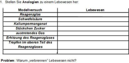 1. Fertigen Sie eine Zeichnung vom Versuchsaufbau an.2. Malen sie die Reaktionsflüssigkeiten farbig aus. Halten Sie die Farbveränderungen fest!3. Stellen Sie die Temperatur durch vorsichtiges Anfassen des Reagenzglases vor Beginn und nach Ablauf des Versuchs fest.4. Saugen Sie die ausströmende Luft ab und testen Sie auf Kohlenstoffdioxid!5. Stellen Sie Analogien zu einem Lebewesen her!